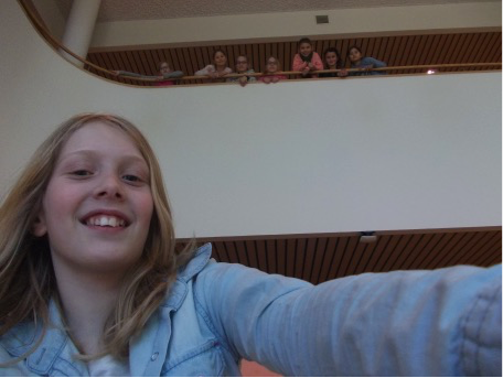 Uiteraard kwamen ook fotografische begrippen als standpunt en kader aan bod. We bekeken een hele reeks bijzondere selfies. Samen onderzochten we hoe deze selfies gemaakt zouden zijn. Hoe houd je de camera vast? Kun je ook spelen met de achtergrond? Vervolgens werden de leerlingen uitgedaagd om aan de hand van een aantal voorwaarden in kleine groepjes creatieve selfies te maken waarbij ze de fotografische begrippen in de praktijk brachten. Aan het einde van de workshop maakten we met de klas een groepsselfie met de selfiestick. En dat was nog best moeilijk, iedereen op de foto krijgen!