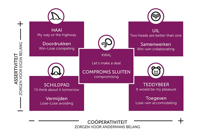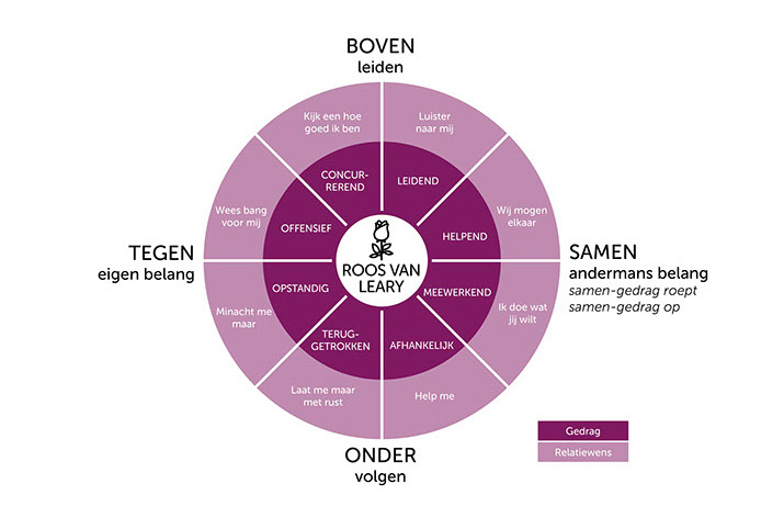 Dit heb ik gedaan op basis van drie modellen. Over samenwerken, leren en gedrag: De Roos van Leary, de leercirkel van Kolb en Conflictstijlen: Thomas-Kilmann model
