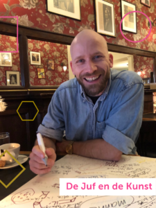De Juf en de Kunst praat met Jochem Bosselaar. Maria Jacobs spreekt met Jochem Bosselaar: beeldend kunstenaar, schrijver en intern cultuurcoördinator bij Kindcentrum Leeuwensteyn. Na een loopbaan als kunstenaar, schrijver en ondernemer stapte hij over naar het onderwijs, op zoek naar meer stabiliteit én betekenis. Binnen Leeuwensteyn – een jonge school met een nieuw, creatief ingericht gebouw – vervult hij een veelzijdige rol: van cultuurcoördinator en leerpleincoach tot docent beeldend vormen en drama.